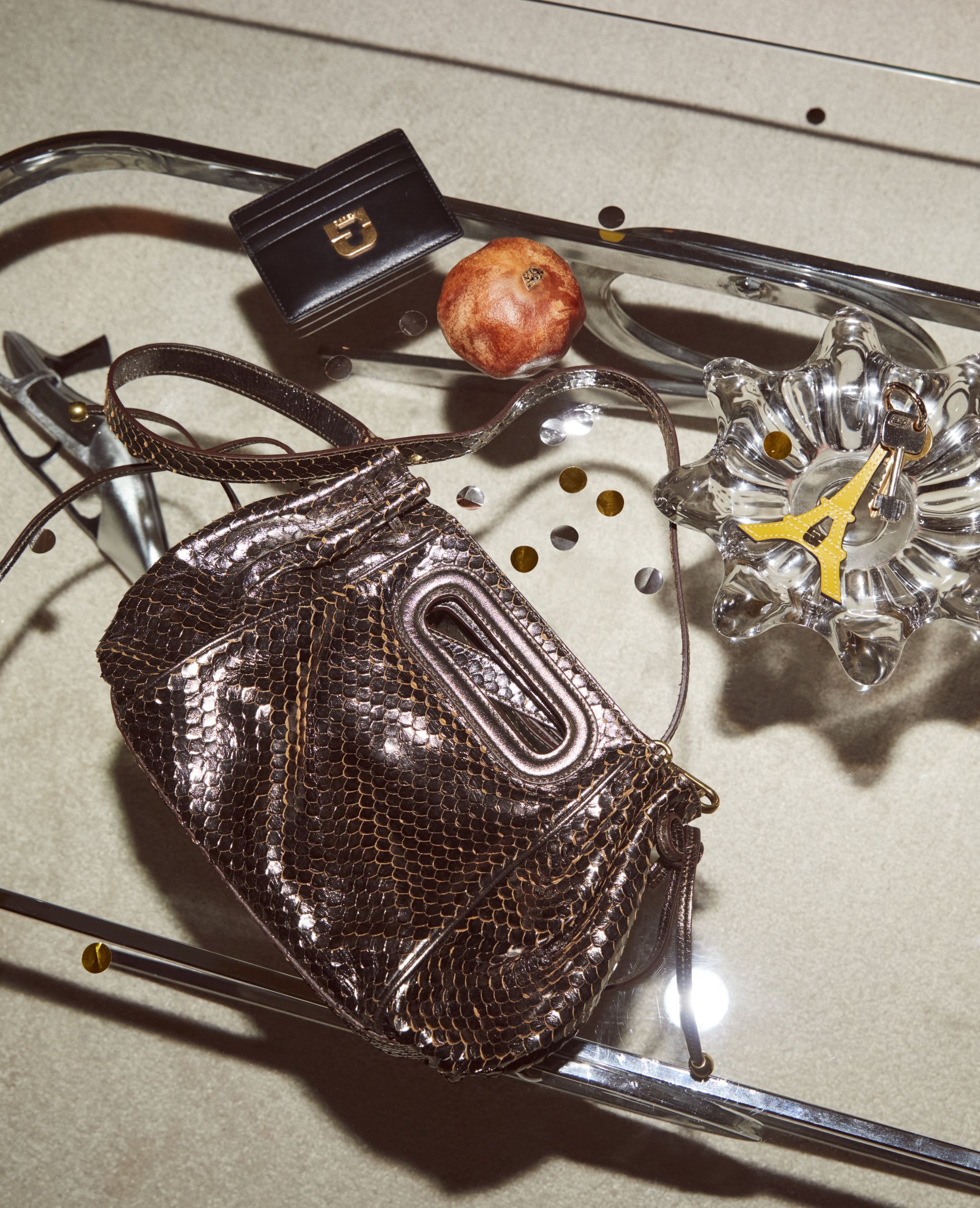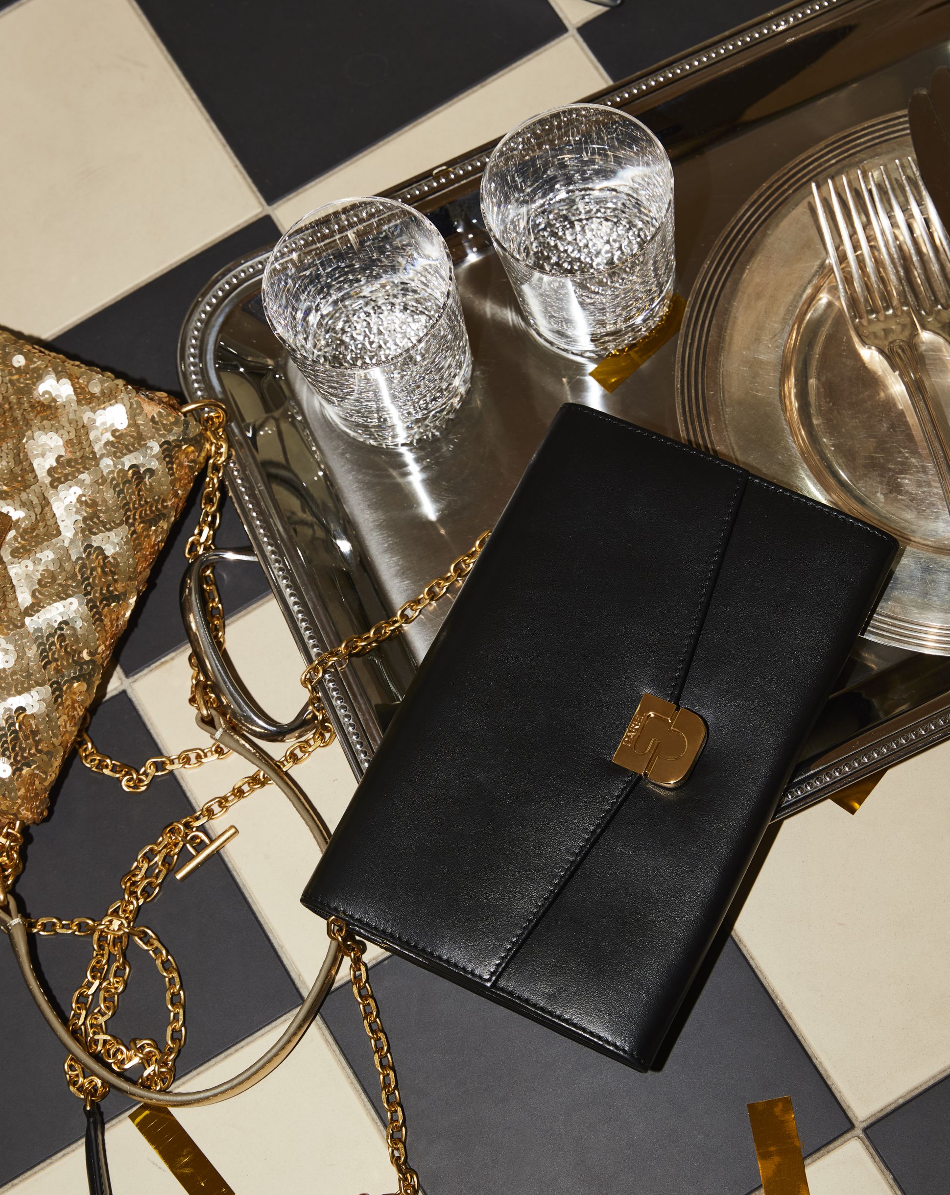 Elegant evening pieces, luminous textures, satin tops, festive accessories, clutches and subtle jewellery accents.